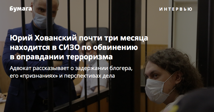Юрия Хованского задержали в начале июня этого года в рамках уголовного дела, возбужденного по части 2 статьи 205.2 УК РФ. По версии следствия, блогер не позднее июля 2020 года «с целью формирования идеологии терроризма, убежденности в ее привлекательности <…> исполнил песню, содержащую, согласно экспертному заключению, признаки публичных призывов к осуществлению террористической деятельности». Речь идет про песню о «Норд-Осте».
