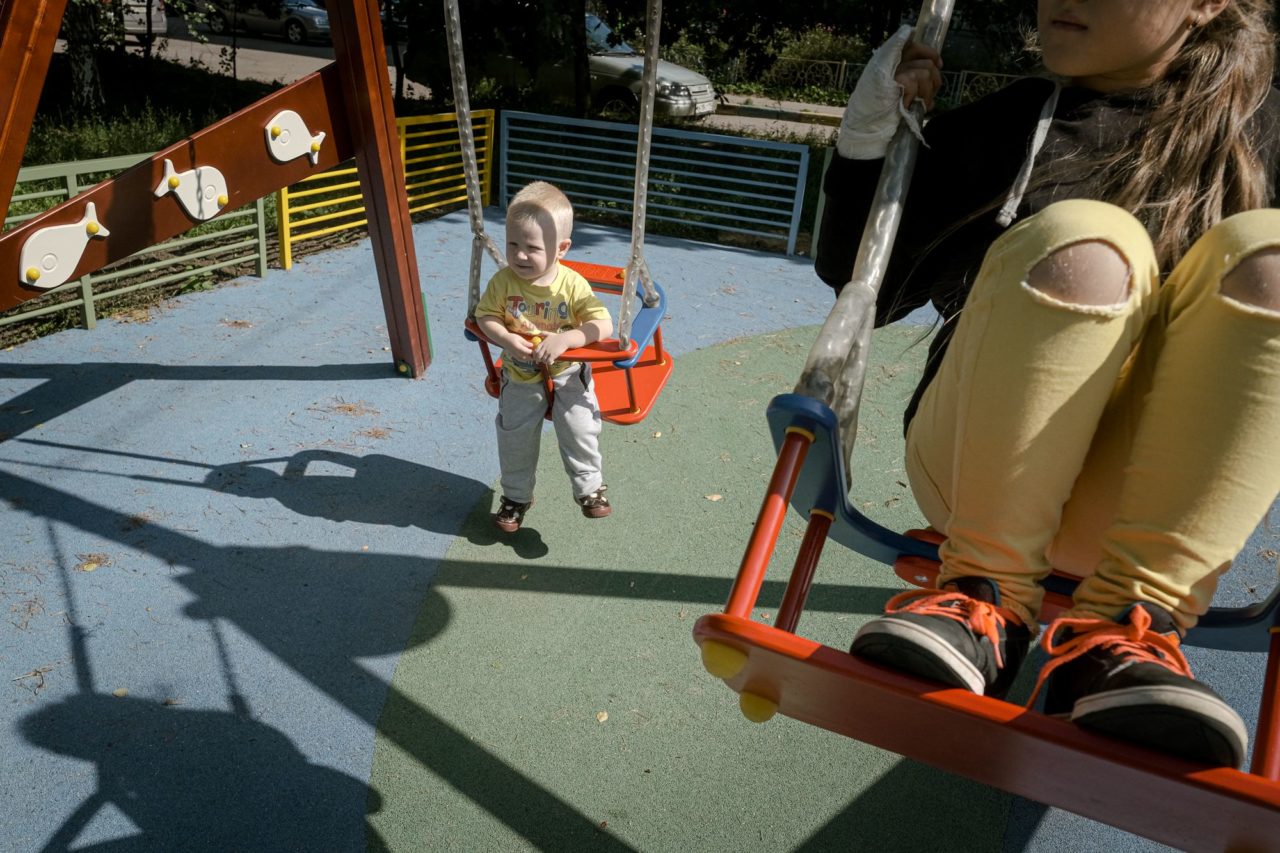 Коля с сестрой качается на качеляхФото: Юлия Скоробогатова для ТД Мы сидим на скамейке в глубине парка, подальше от шумной музыки. Варя и Ваня тихо уткнулись в телефон, смотрят какое-то детское шоу на YouTube, Коля же постоянно в движении — изучает местную флору, катает самокат, примеряет шлем старшего брата и непрерывно улыбается.