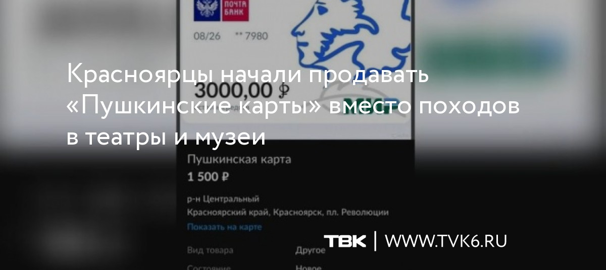 За «Пушкинскую карту» в объявлениях красноярцы просят 1,5 тыс. руб. Это в 2 раза меньше, чем баланс карты – сейчас на счету 3 тыс. руб., а в 2022 г. государство пополнит его еще на 5 тыс. руб. Аналогичные объявления появились и в других регионах.