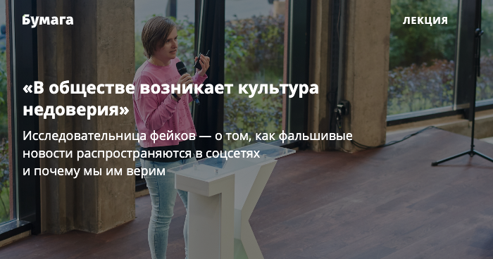 Как ученые исследуют фейки, почему фальшивые новости распространяются в соцсетях не так, как обычные, и что повышает доверие к ложным сообщениям? Об этом на нашем просветительском фестивале «Кампус» рассказала исследовательница фейков Виктория Взятышева. «Бумага» публикует конспект лекции. Посмотреть это и другие выступления в записи можно по ссылке.