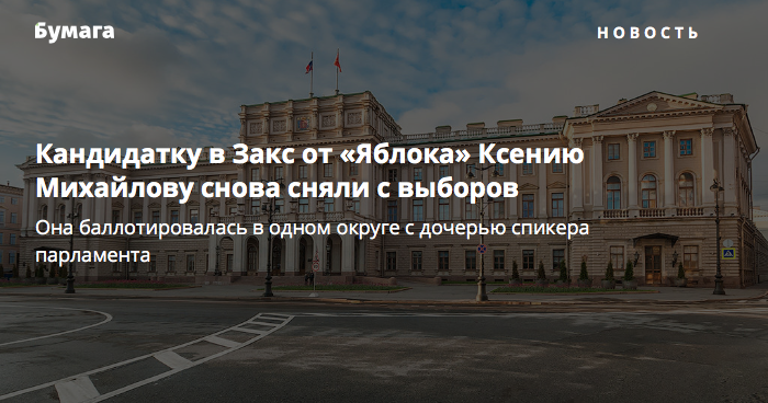 Горсуд снял с выборов кандидатку в Законодательное собрание от партии «Яблоко» Ксению Михайлову. Ее регистрацию обжаловал кандидат по третьему округу Петроградского района от КПРФ Роман Луговской. Об этом сообщила объединенная пресс-служба судов Петербурга.