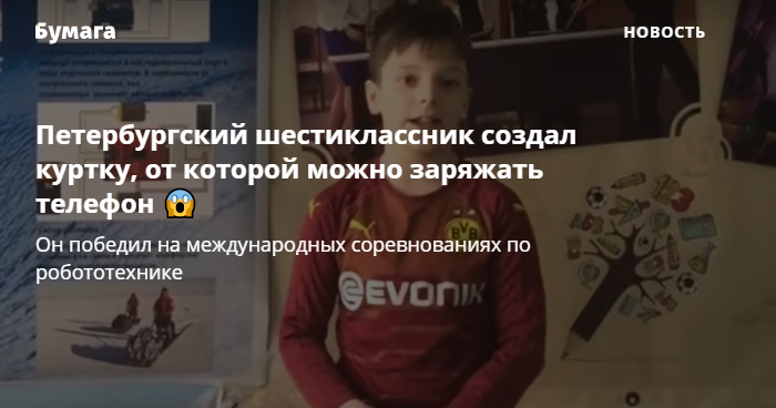 Петербургский шестиклассник победил на международных соревнованиях по робототехнике. Он создал куртку, от которой можно заряжать телефон 😱