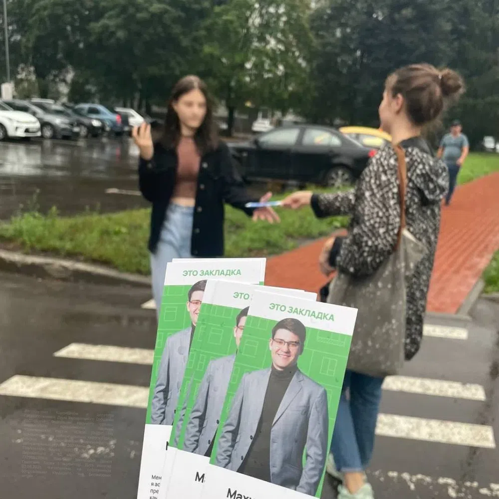 Пока Непша рассказывал о том, что Саблин назвал команду Махницкого провокаторами, которые хотели перенести в жилые дома помойки, я наблюдала за агитаторами. Трое молодых людей в зеленых футболках с именем Махницкого подходят к людям с «закладками» (небольшими агитационным брошюрами, которые можно использовать как закладки для книг) и пытаются им рассказать о том, что есть такой «молодой и перспективный Данил Махницкий», который будет представлять их интересы в Думе, если они за него проголосуют.