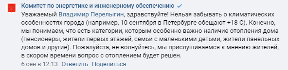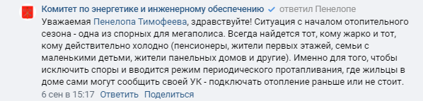 Во-вторых, чиновники говорят, что ситуация с началом отопительного сезона — «одна из спорных для мегаполиса». Одним всегда будет жарко, другим — холодно.