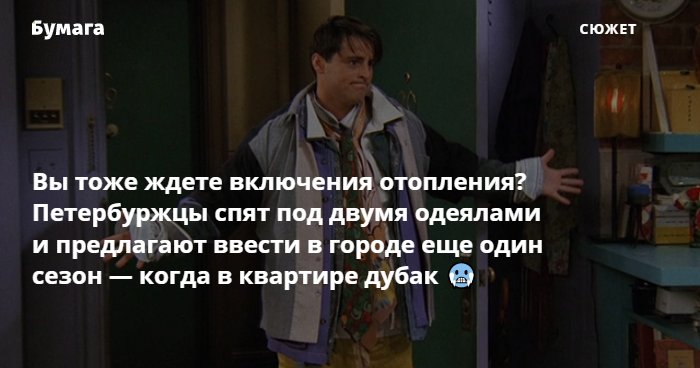 В соцсетях предлагают выделить в Петербурге особое время года: «ёпаныйхолодильник». «Это означает время года, когда отопление еще не подключили или уже отключили и в квартире стоит дубак», — шутят пользователи.