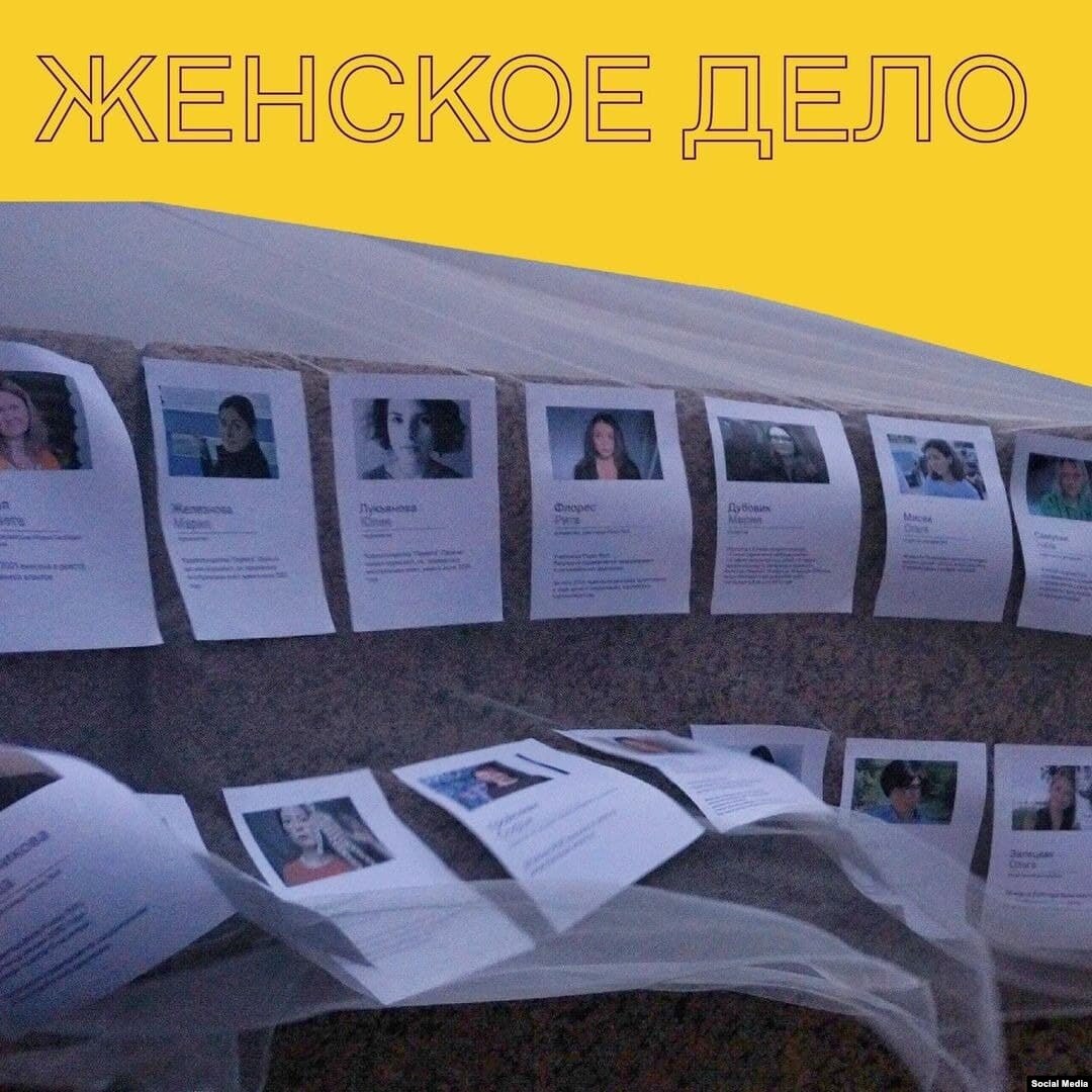 На фотографиях изображены сибирская художница "Юлия Цветкова", которую обвиняют в распространении порнографии из-за публикаций картинок в паблике "Монологи вагины", первая в России приговоренная по статье об "осуществлении деятельности нежелательной иностранной организации" Анастасия Шевченко, пресс-секретарь Алексея Навального Кира Ярмыш, политик Любовь Соболь, участницы Pussy Riot, признанные "иностранными агентами" художница Дарья Апахончич и журналистки Север.Реалии Людмила Савицкая и Елизавета Маетная.