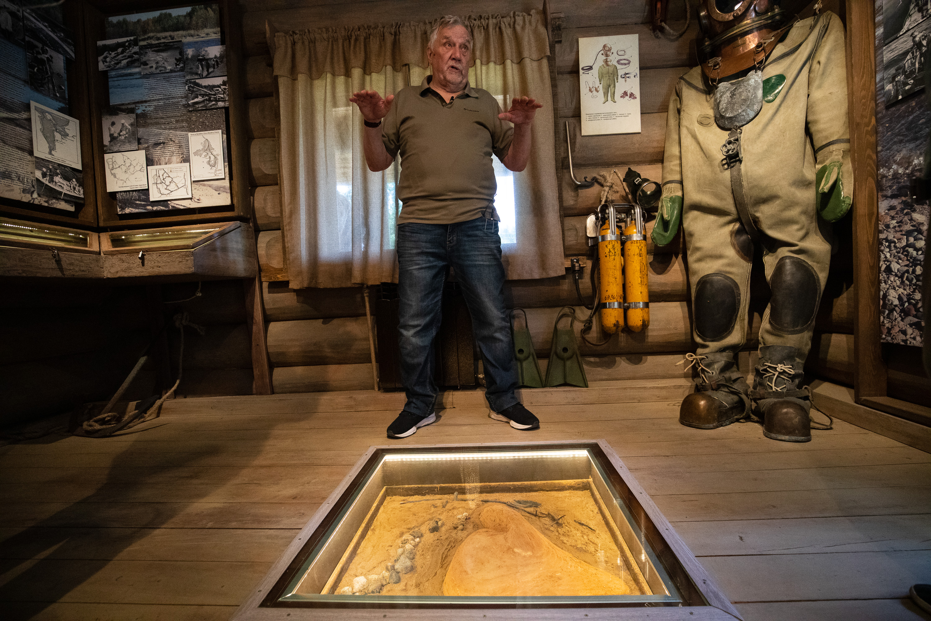 «Это массив примерно 200 на 200 метров, состоящий из так называемого красного девонского песчаника, который оказался под водой результате изменения уровня озера», — объясняет Потресов, показывая макет из папье-маше. Он уверен: 800 лет назад камень возвышалась над низким берегом озера и служил хорошим ориентиром, но потом вода поднялась, и песчаник растворился. «Это примерно то же самое, что положить кусок сахара на сырое блюдце. Он расплылся и прекратил свое существование», — уверяет директор музея.