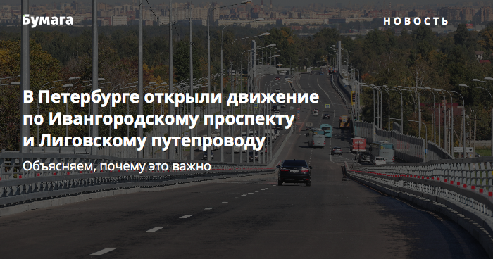 Петербургские власти открыли движение по Ивангородскому проспекту и Лиговскому путепроводу. Об этом «Бумаге» сообщили в пресс-службе городской администрации.