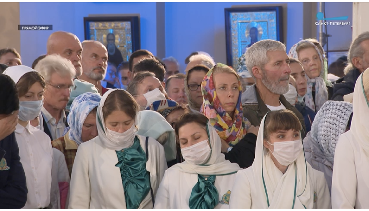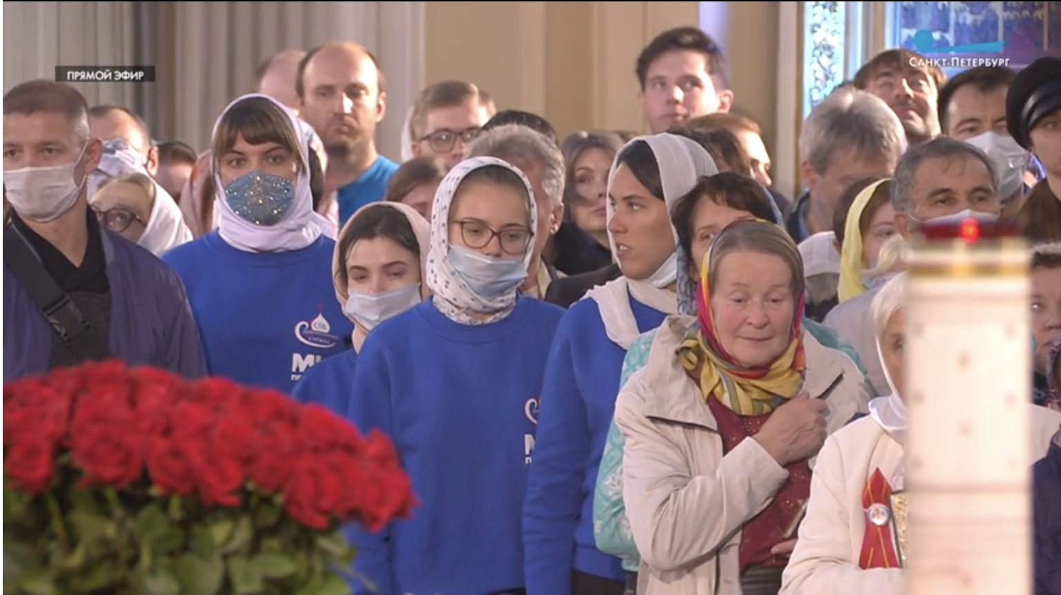 Сколько пригласительных было выдано на службу с Патриархом Кириллом — неизвестно. Однако на трансляции видно, что верующие не соблюдают социальную дистанцию, некоторые из них не пользуются медицинскими масками.