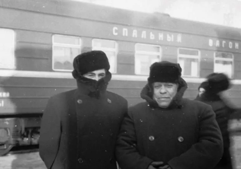 Жоржи Амаду (слева) и Николас Гильен на пути в Китай на железнодорожном вокзале в СССР, январь 1952 года. Фото из архива Паломы Амаду. Источник