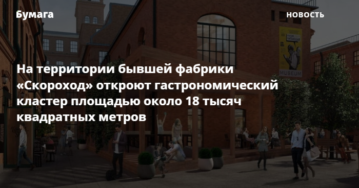 На территории бывшей обувной фабрики «Скороход» рядом со станцией метро «Московские ворота» откроют гастрономический кластер, сообщили «Бумаге» создатели проекта. Пространство станет частью пешеходного лофт-квартала, площадь гастрокластера составит порядка 18 тысяч квадратных метров.