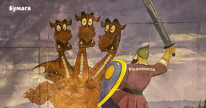 На изображении Ржаненков-богатырь замахивается мечом на Змея Горыныча, каждая голова которого — один из Вишневских.