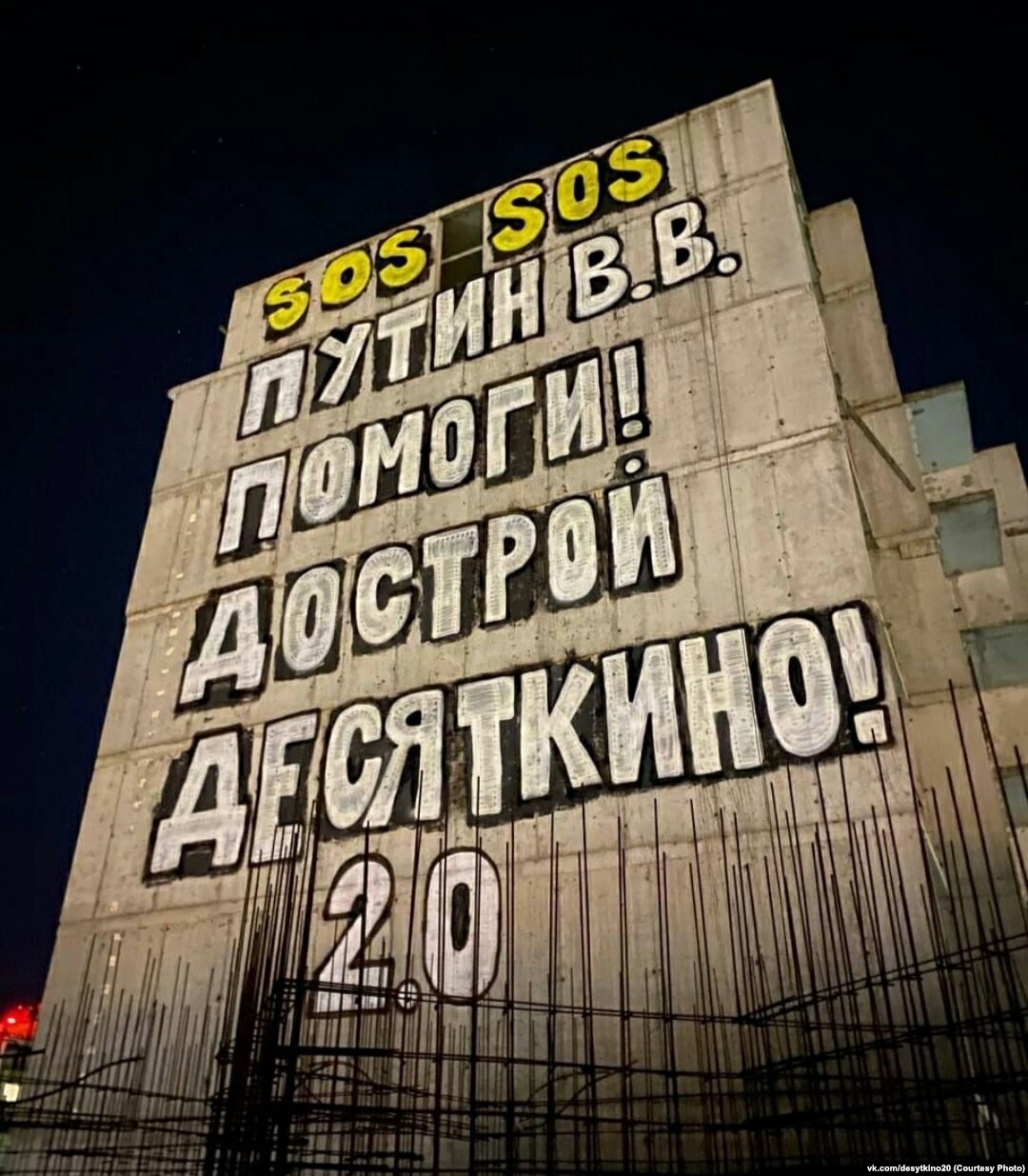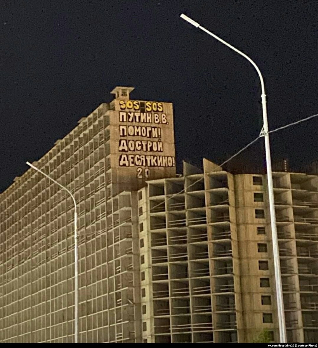 - Купившие квартиры в "Десяткино 2.0" в 2020 году также обращались к Путину через надпись на стене дома: "SOS. Путин В.В., помоги! Дострой Десяткино 2.0!". Надпись закрасили в течение суток.