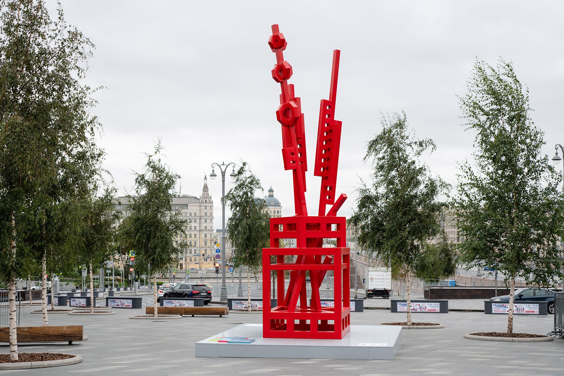 По сюжету это действительно просто ваза с цветами. Это как бы рисунок в воздухе, то есть там нет плоскостей, а только линии: вот ваза, вот в нее вложены цветы, вот уровень воды. Так что сюжет такой, вполне миролюбивый. Прототипом большой красной работы, выставленной в «Зарядье», послужила работа 2005 года, сделанная в Москве. Это старая идея, еще в 1975 году я делал примерно такие вещи. И здесь их повторил, но я делал в маленьких размерах все это, в условиях мастерской. Предложение увеличить ее до семи метров и выставить в городе явилось для меня неожиданностью.