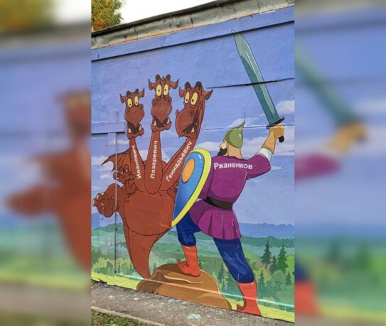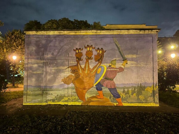 На стрит-арте богатырь собирается рубить голову Змею Горынычу, каждая из голов которого символизирует одного из трёх Вишневских, отличающихся друг от друга только отчествами.