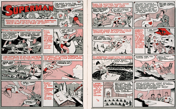 Тот же Грант Моррисон — автор не только графических романов, но и «самого полного путеводителя по миру супергероев» — в книге «Супербоги: как герои в масках, удивительные мутанты и бог солнца из Смолвиля учат нас быть людьми» напоминает, что в 1941 году журнал «Look» опубликовал комикс «Как Супермен прекратил бы войну». Действительно, было бы странно, если б Супермен, неустанно спасающий Землю от инопланетных нашествий, проигнорировал бы Вторую мировую; так вот, что бы он сделал?.. Сперва бы он, понятно, ворвался в бункер фюрера (где сразу схватил бы «хнычущего диктатора за горло»), а потом... Потом он навестил бы еще и его «приятеля» — Сталина! — и доставил обоих в женевскую штаб-квартиру Лиги Наций. Где «похожий на директора школы человек с председательским молотком» быстро бы вынес им суровый вердикт: «Адольф Гитлер и Иосиф Сталин, мы признаем вас виновными в величайшем преступлении современной истории — неспровоцированной агрессии против беззащитных стран».