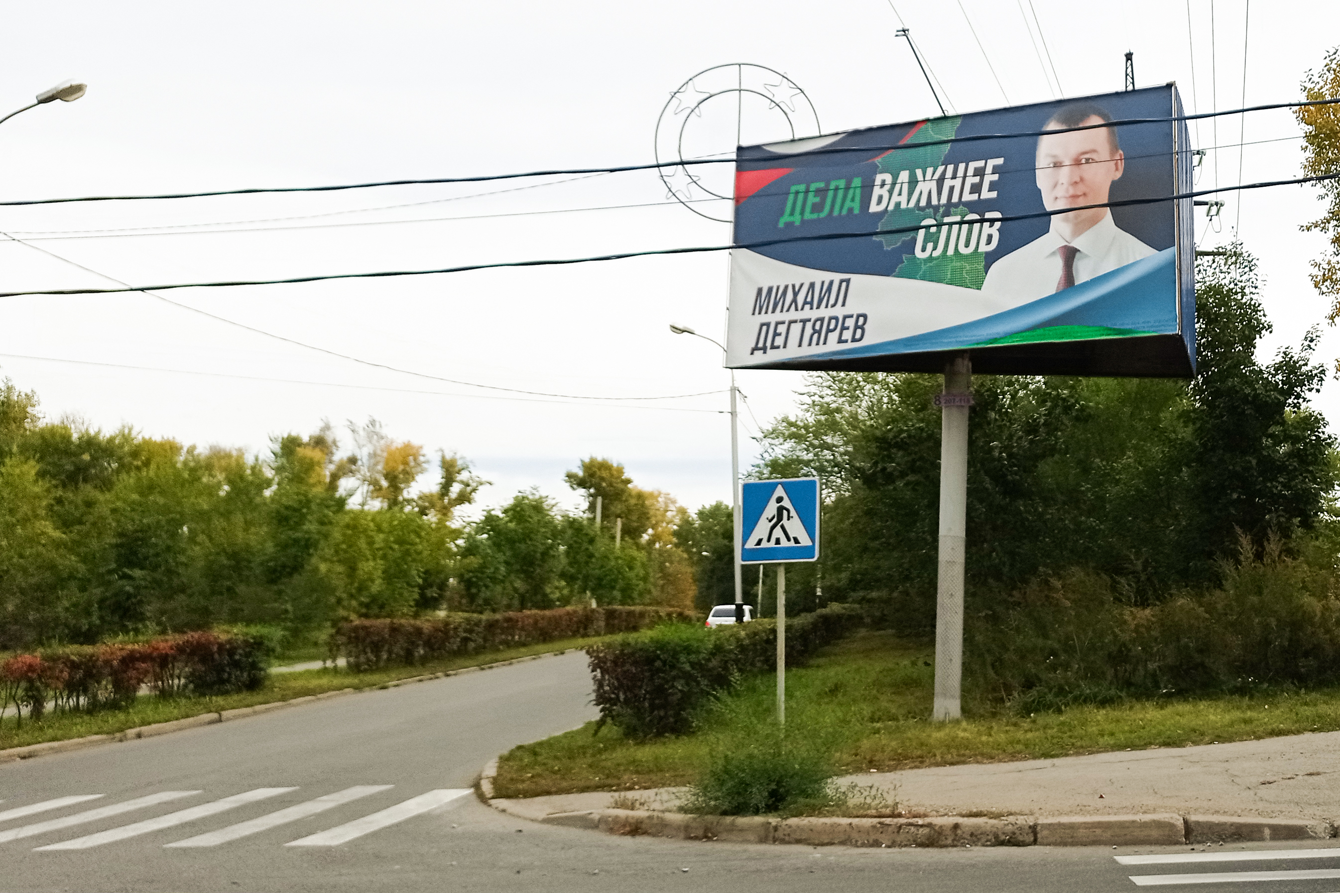 В местных СМИ активно продвигается информация о любых преобразованиях в регионе как о достижениях нового врио – идет ли речь о расселении ветхо-аварийного жилья, деньги на которое "выбил Дегтярев", или о строительстве спортплощадки "по поручению Дегтярева". Активно в ход идет и административный ресурс – в начале сентября учебники по дальневосточной литературе для первоклассников выдали с портретом Дегтярева на первой странице.