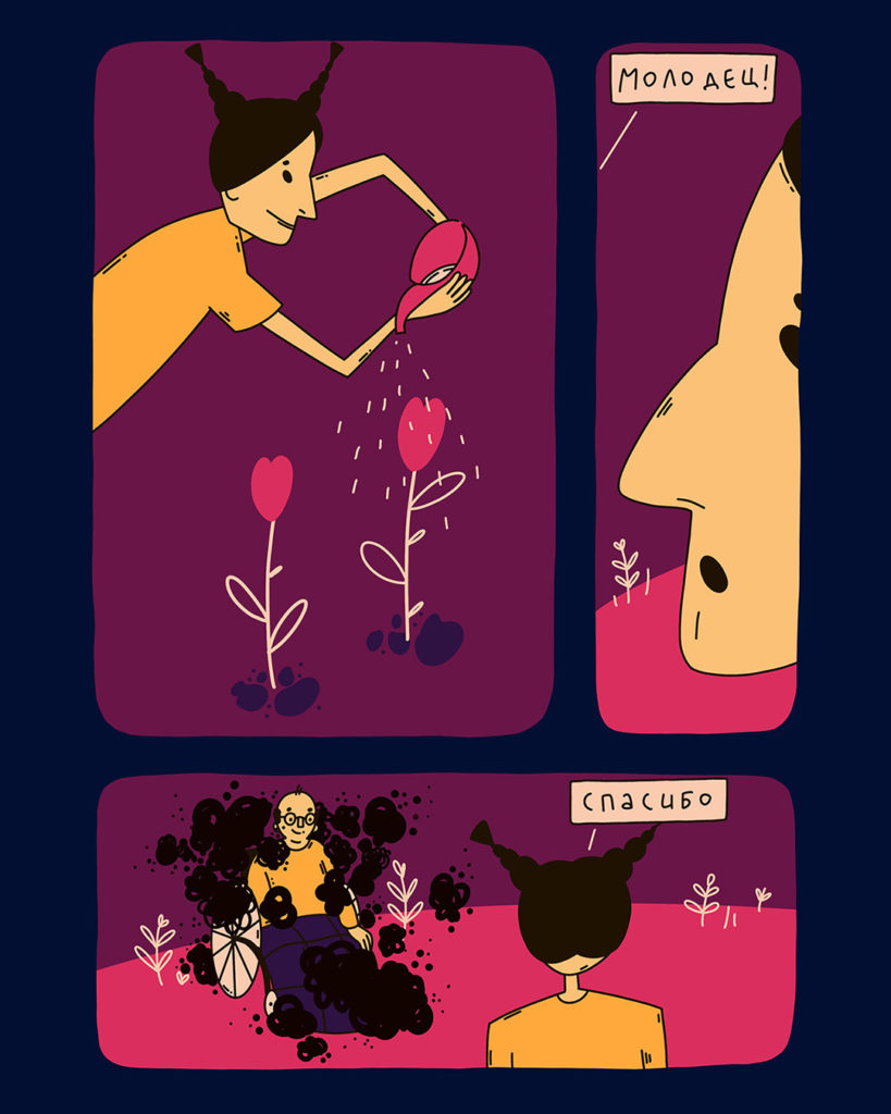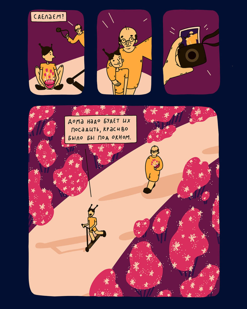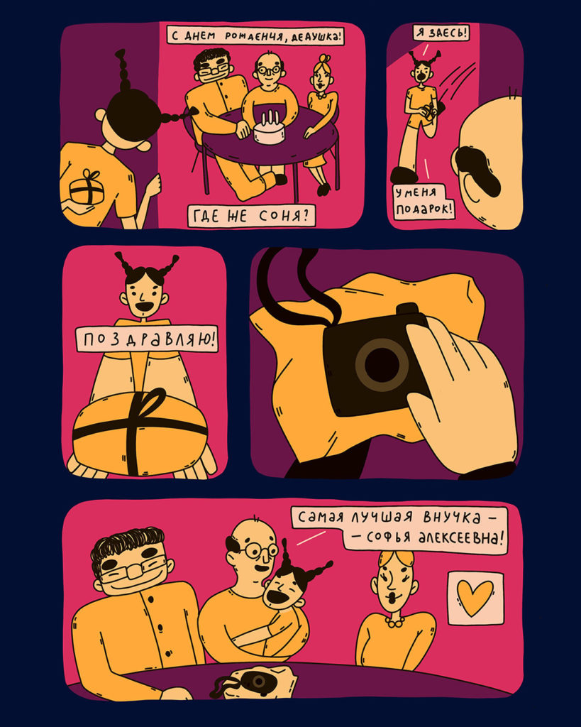 Иллюстрация: Соня Ярымова Хочу поблагодарить Аню Саруханову за помощь и кураторство в создании этого проекта. И конечно же, спасибо моему дедушке Юре, ты навсегда в моем сердце.