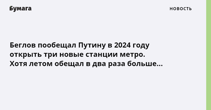 Губернатор Петербурга Александр Беглов пообещал президенту России Владимиру Путину в 2024 году открыть три новые станции метро. Это меньше, чем губернатор обещал президенту в прошлый раз. Стенограмма встречи приведена на сайте Кремля.