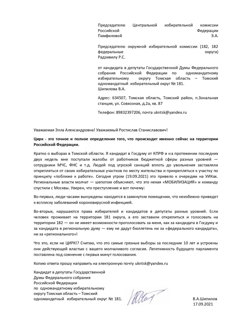 «На протяжении последних двух недель мне поступали жалобы от работников бюджетной сферы разных уровней — сотрудники МЧС, ФНС и т. д. Людей под угрозой санкций вплоть до увольнения заставляли открепляться от своих участков по месту жительства и прикрепляться к участку по принципу „поближе к работе“, — говорится в опубликованном обращении Шипилова. — Сегодня утром (19.09.2021) это привело к очередям на УИКах. Региональные власти молчат — шепотом объясняют, что это некая „Мобилизация“ и команду спустили с Москвы».
