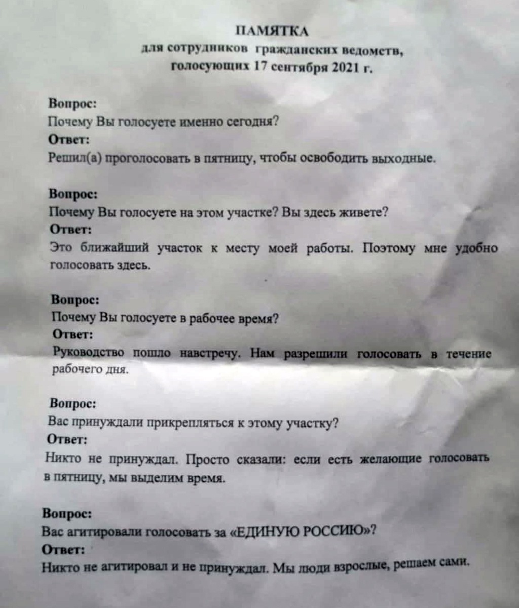 На выборах Госдумы в Сибири организовано массовое принуждение бюджетников голосовать утром 17 сентября, заявил томский кандидат в Госдуму Василий Шипилов (КПРФ). Он заявил, что решение было принято по «команде Москвы», и обратился в ЦИК. В распоряжении Тайги.инфо также оказалась копия возможной инструкции, как отвечать на вопросы тем, кого централизованно привели голосовать на участки.