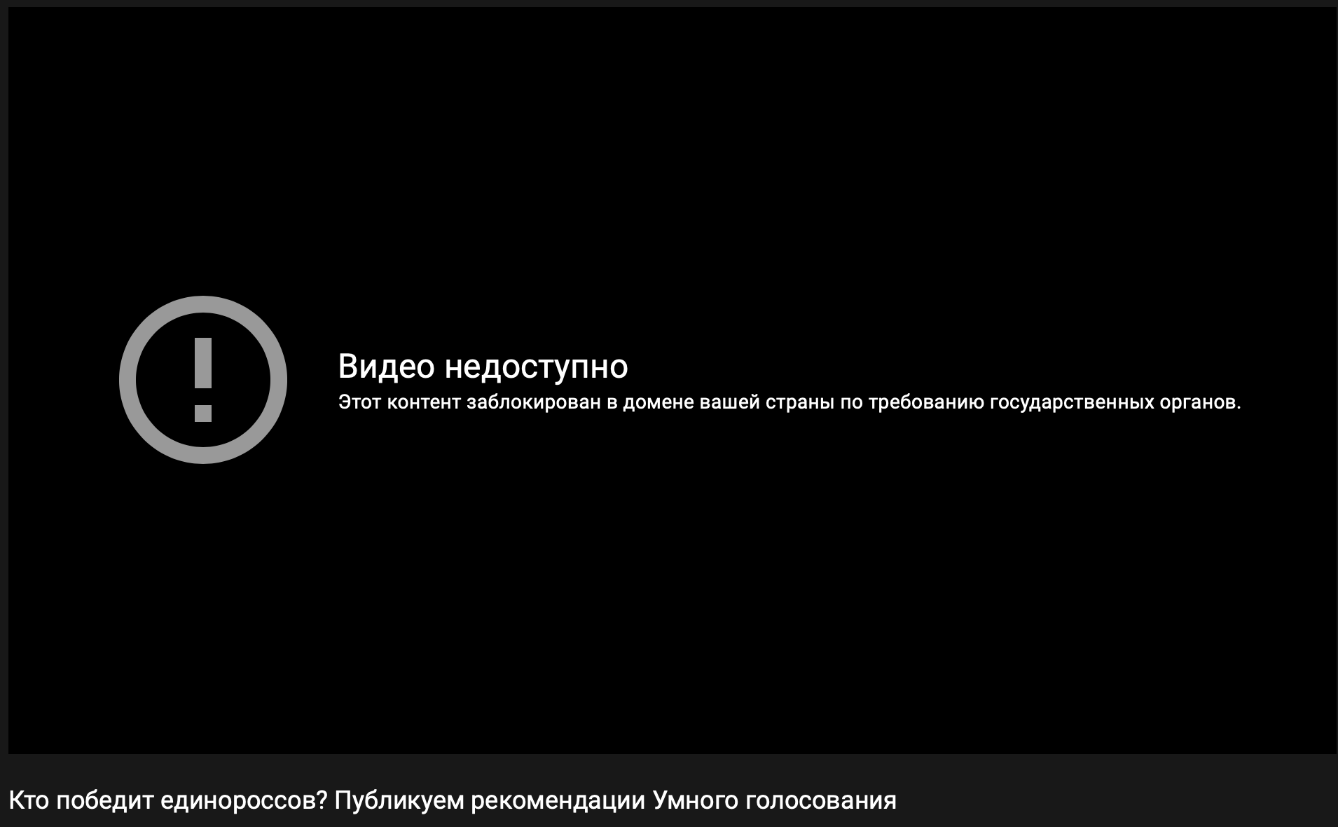 Теперь YouTube предупреждает, что ролик заблокирован «по требованию государственных органов». Второе видео, в котором предлагаемые «Умным голосованием» кандидаты показываются слайдами, также недоступно. При этом с VPN можно посмотреть оба ролика.