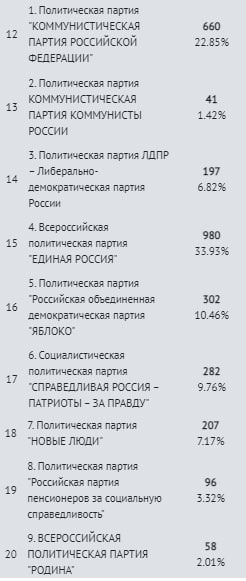 Далее идёт КПРФ 22,85 процента, на третьем месте «Яблоко» - 10,46%, «СР» - 9,76%, «Новые люди» - 7,17%, ЛДПР - 6,82%.