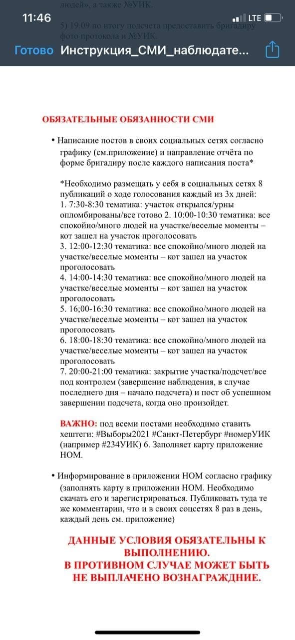 В первый день выборов депутатов Госдумы и региональных парламентов Север.Реалии получил копию инструкции для блогеров-наблюдателей от партии "Новые люди" в Петербурге, а также скриншоты с перепиской в чате блогеров-наблюдателей. Редакции их предоставил сотрудник одной из бюджетных организаций города, попросивший не называть его фамилию. По его словам, в список наблюдателей его включили "добровольно-принудительно". За первые два дня ему должны заплатить по 3 тысячи рублей за день, за последний – 4 тысячи рублей.