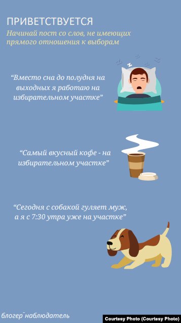 Посты рекомендуют начинать со слов "не имеющих прямого отношения к выборам": "Вместо сна до полудня на выходных я работаю на избирательном участке", "Самый вкусный кофе – на избирательном участке", "Сегодня с собакой гуляет муж, а я с 7:30 утра уже на участке".
