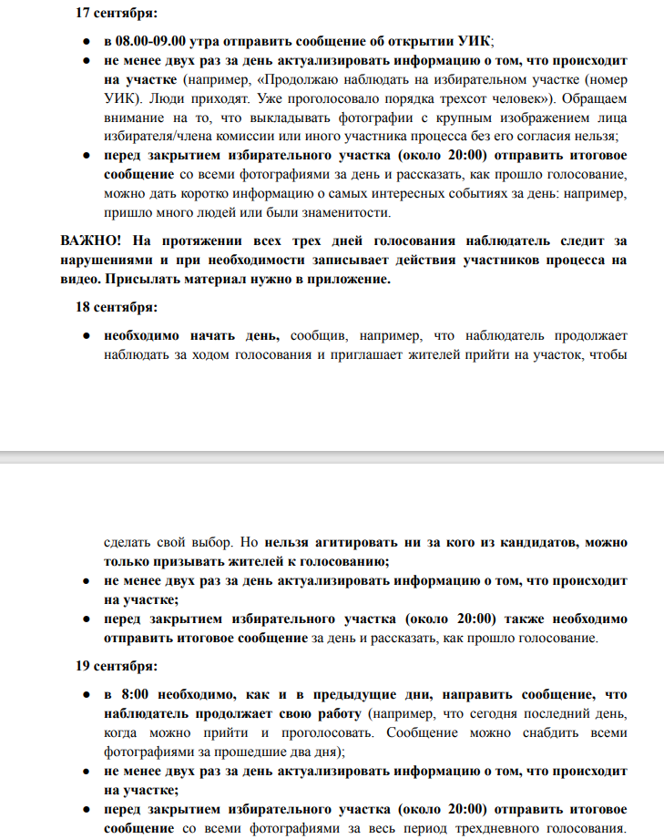 В инструкции подробно рассказывается, что публиковать в каждый день выборов. 17 сентября нужно сделать запись об открытии участка с 8 до 9 утра, "не менее двух раз за день актуализировать информацию о том, что происходит на участке" и сделать заключительную запись перед закрытием участка. 18 и 19 сентября наблюдателей просят начать день с сообщения о продолжении наблюдения и "не менее двух раз за день актуализировать информацию о том, что происходит на участке". Все материалы нужно также снабжать хештегами. За три дня надо отправить не менее 12 сообщений.