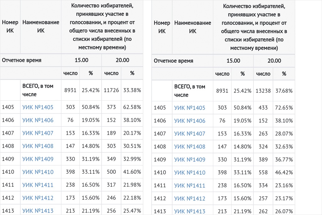 Чернов опубликовал скриншоты с сайта ЦИК, сделанные после завершения голосования 18 сентября, и те, что были сделаны утром 19 сентября. Они серьезно отличаются в Таштагольском районе. Например, на УИК №1405 к вечеру 17 сентября проголосовали 373 человека (62,85%), а позже данные на эту же дату изменили на 433 (72,65%). На УИК №1407 цифры поменялись со 189 до 263 и так далее. Результаты практически каждой участковой комиссии были изменены задним числом.