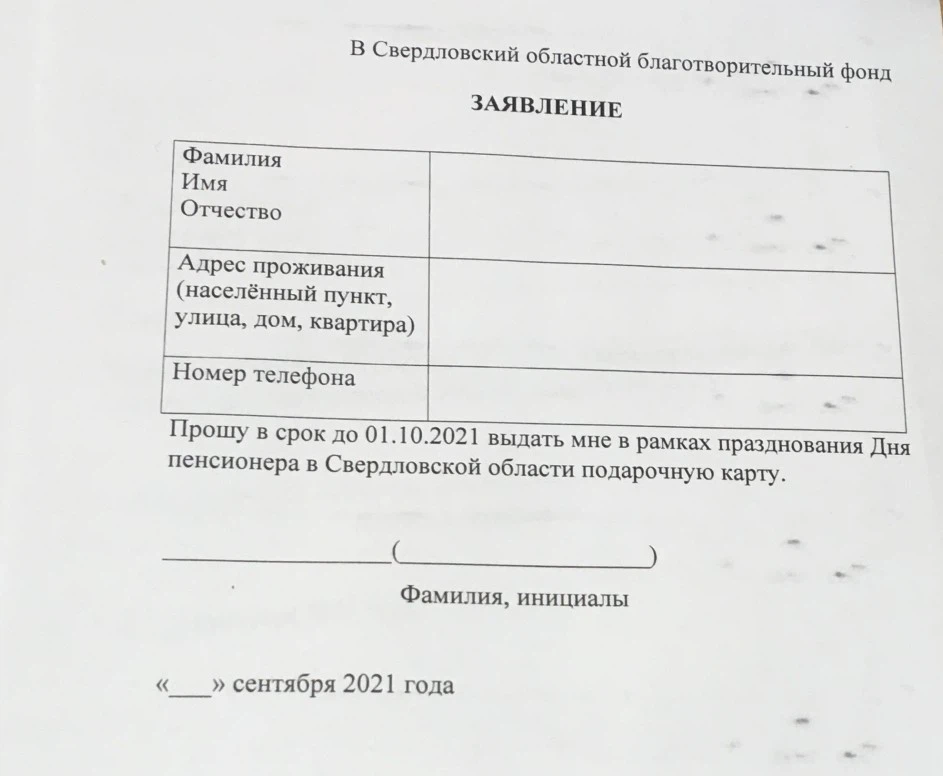 Всех обделенных подарком просят заполнить бланк заявления. Пишется оно на Свердловский областной благотворительный фонд.