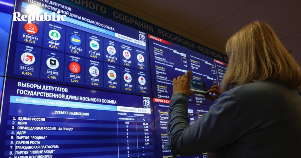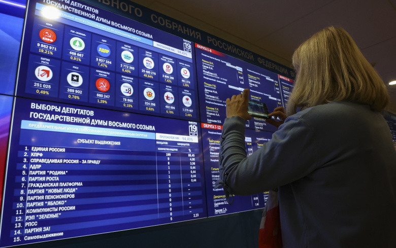 Табло с предварительными итогами выборов депутатов Госдумы РФ, законодательных органов и глав субъектов федерации в Информационном центре Центральной избирательной комиссии РФ. Фото: Yuri Kochetkov / EPA / TASS