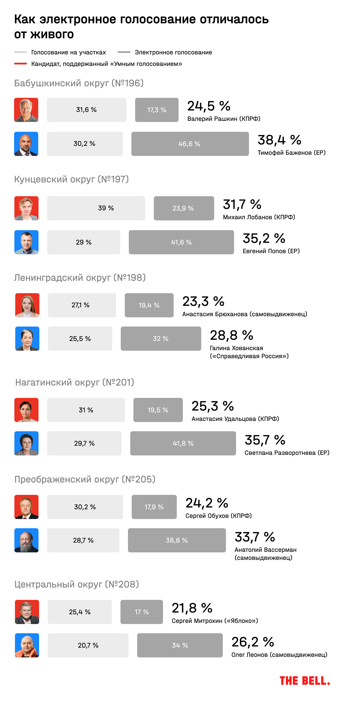 • ЦИК не публикует сравнительные цифры результатов офлайн- и онлайн-голосования. Но The Bell на основании данных Мосгоризбиркома вручную посчитал разницу в результатах по 6 из 15 московских одномандатных округов, где выдвигались самые известные протестные кандидаты, поддержанные «Умным голосованием». В каждом из этих округов протестный кандидат выиграл голосование на участках, но с сокрушительным счетом проиграл электронное голосование.