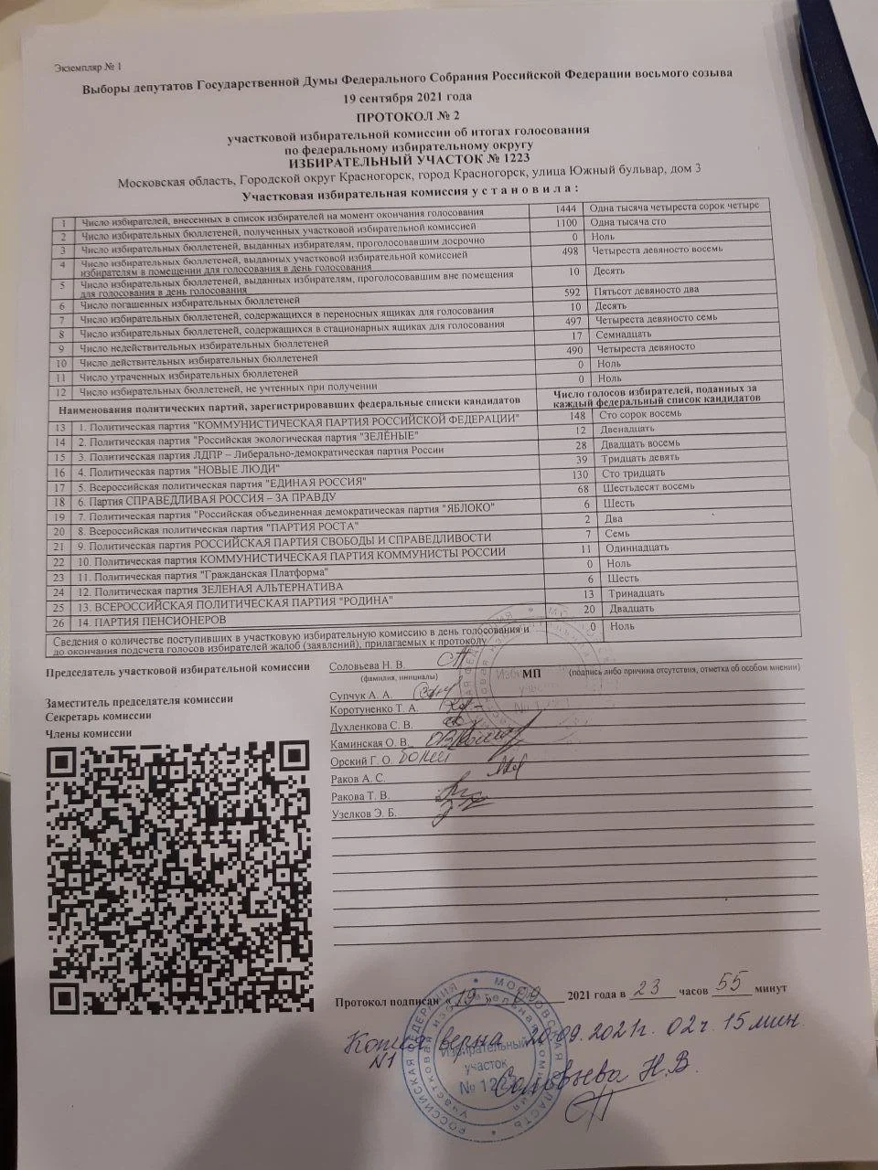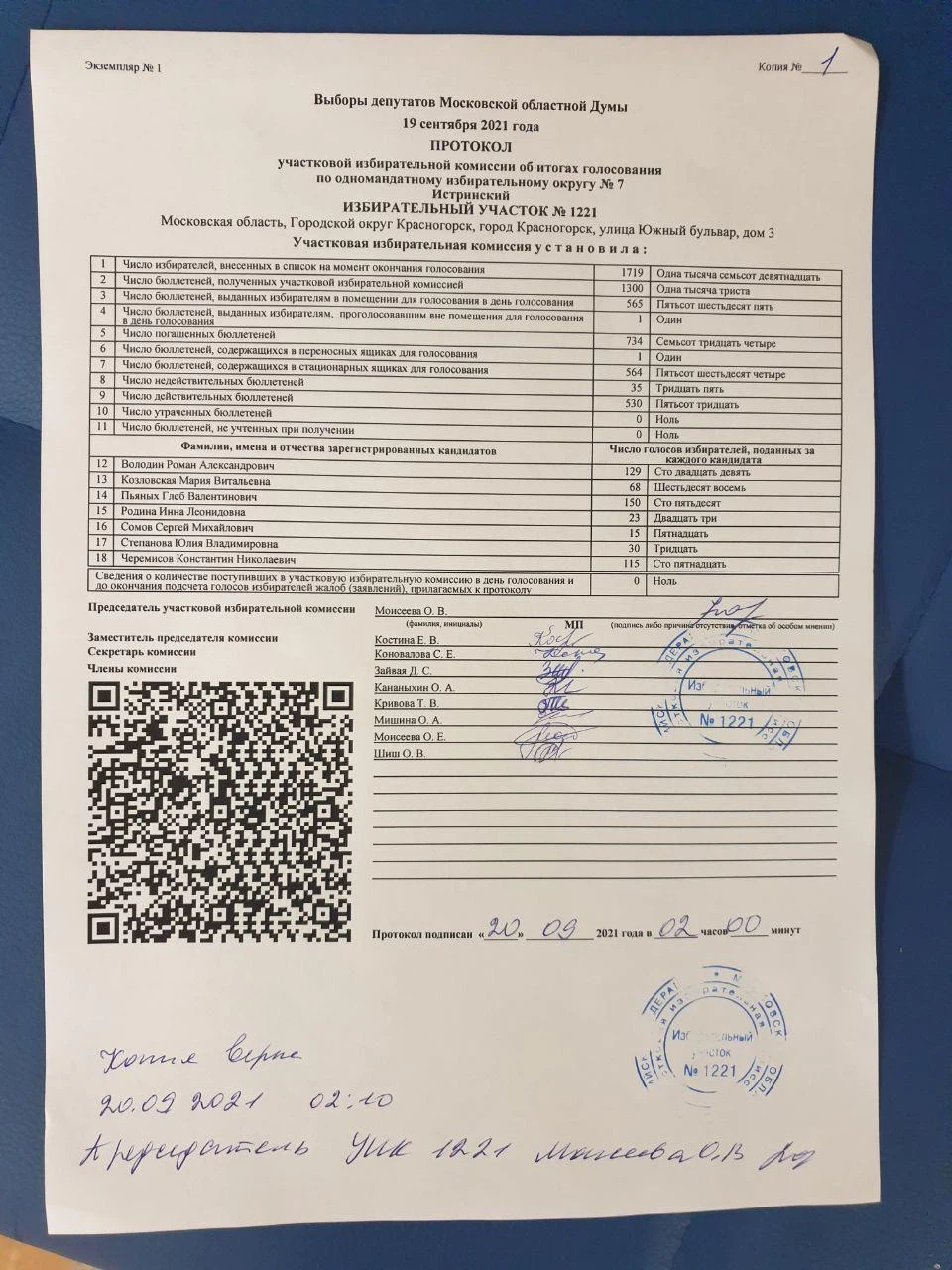 По данным протокола «по федеральному избирательному округу в Государственную Думу», на участке № 1221 «Единая Россия» получила 148 подписей, однако на сайте указано 448. Цифры расходятся и в «итогах голосования в Московскую Областную Думу»: «Единая Россия» получила 132 голоса, но на сайте ЦИКа указана цифра 433.
