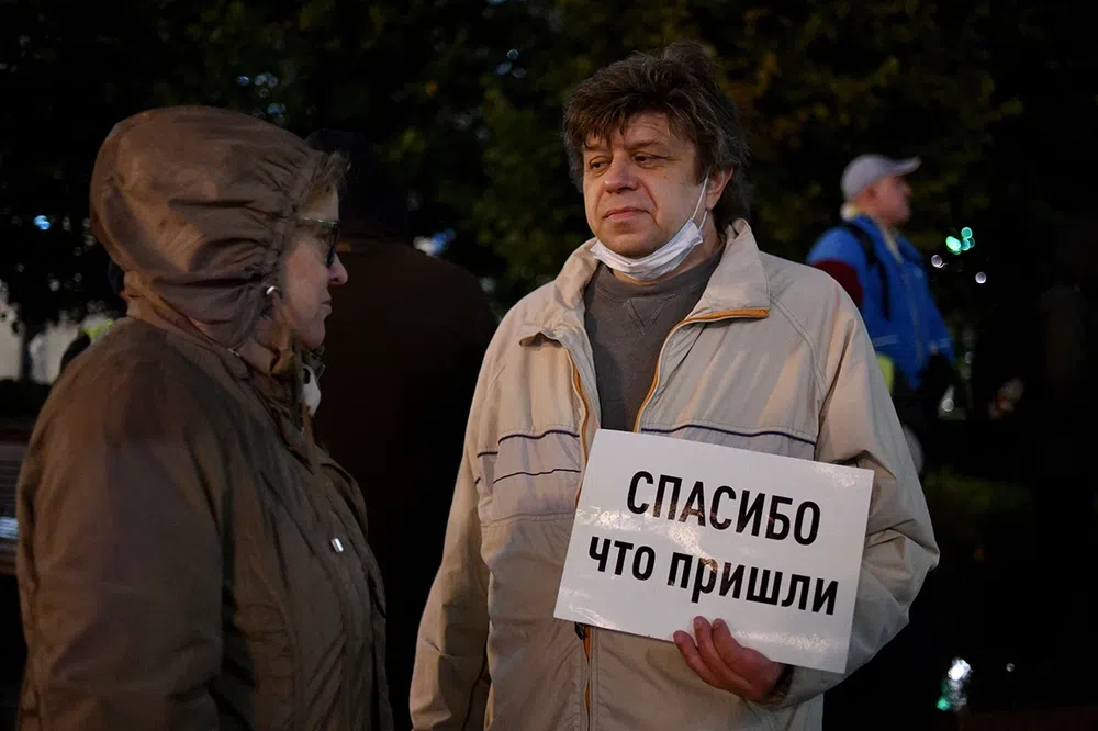 — Я пришла сюда с бабушкой, — говорит Аня, «репетиторка по русскому и литературе». — У нас Кунцевский округ. У нас депутатом от «Умного голосования» был Михаил Лобанов из КПРФ, и мы голосовали за него. Я почему-то неожиданно была уверена, что он пройдет и что другие кандидаты от «Умного голосования» пройдут. У меня молодой человек был наблюдателем, мы обсуждали, что, конечно, будут какие-то фальсификации, но думали, что это будет там, где маленький разрыв и его легко подкорректировать, а где большой — ничего не будут делать. И мне суперобидно, что так все сложилось, потому что он с большим отрывом выигрывал по очному голосованию. Результаты онлайн-голосования задержали на 10 часов. Когда я проснулась и узнала, как это все обернулось, у меня была большая истерика, я очень расстроилась. Я понимала, что там есть определенный градус бреда и абсурда, но это очень сильно расширило мои границы абсурда. И мы решили сюда прийти. Я не думаю, что это что-то даст, но просто мне захотелось какого-то личного действия. Захотелось какого-то такого соседского, городского момента.