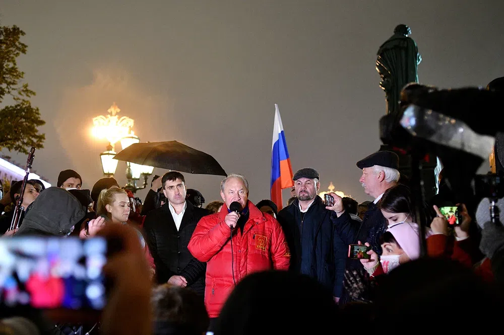 За спиной Пушкина, стоя на самой высокой ступени лестницы, ведущей к постаменту, выступает Валерий Рашкин. Один из организаторов акции просит журналистов спуститься вниз, «на три-четыре метра от президиума», но десятки журналистов облепляют Рашкина, заслоняя «президиум» от митингующих. Рашкина не видно, слышно лишь его срывающийся голос, обличающий «путинскую власть», которая «начинает навязывать электронную удавку на шею всем избирателям» и восхищающийся москвичами, которые «доверили КПРФ формировать власть в Москве».