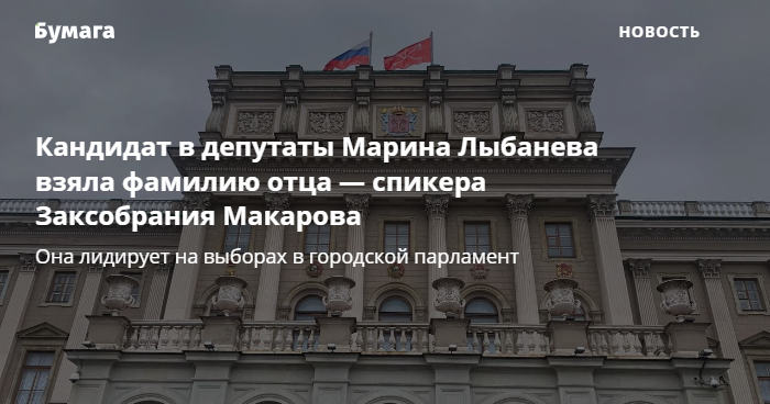 Кандидат в депутаты Законодательного собрания по округу № 3 Марина Лыбанева решила сменить фамилию. Она подала заявление в районный ЗАГС, чтобы взять фамилию своего отца — спикера Заксобрания шестого созыва Вячеслава Макарова. Об этом пишут «Закс.ру» со ссылкой на штаб Лыбаневой и «Фонтанка».