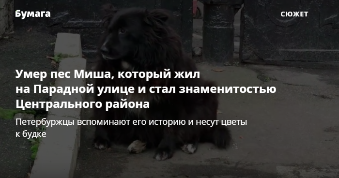 В Петербурге скончался пес Миша, который много лет жил на Парадной улице и стал местной знаменитостью — его будку даже нанесли на карты Google. Горожане вспоминают, каким ласковым был пес, и жалеют, что он так и не нашел дом. «Бумага» рассказывает историю собаки.