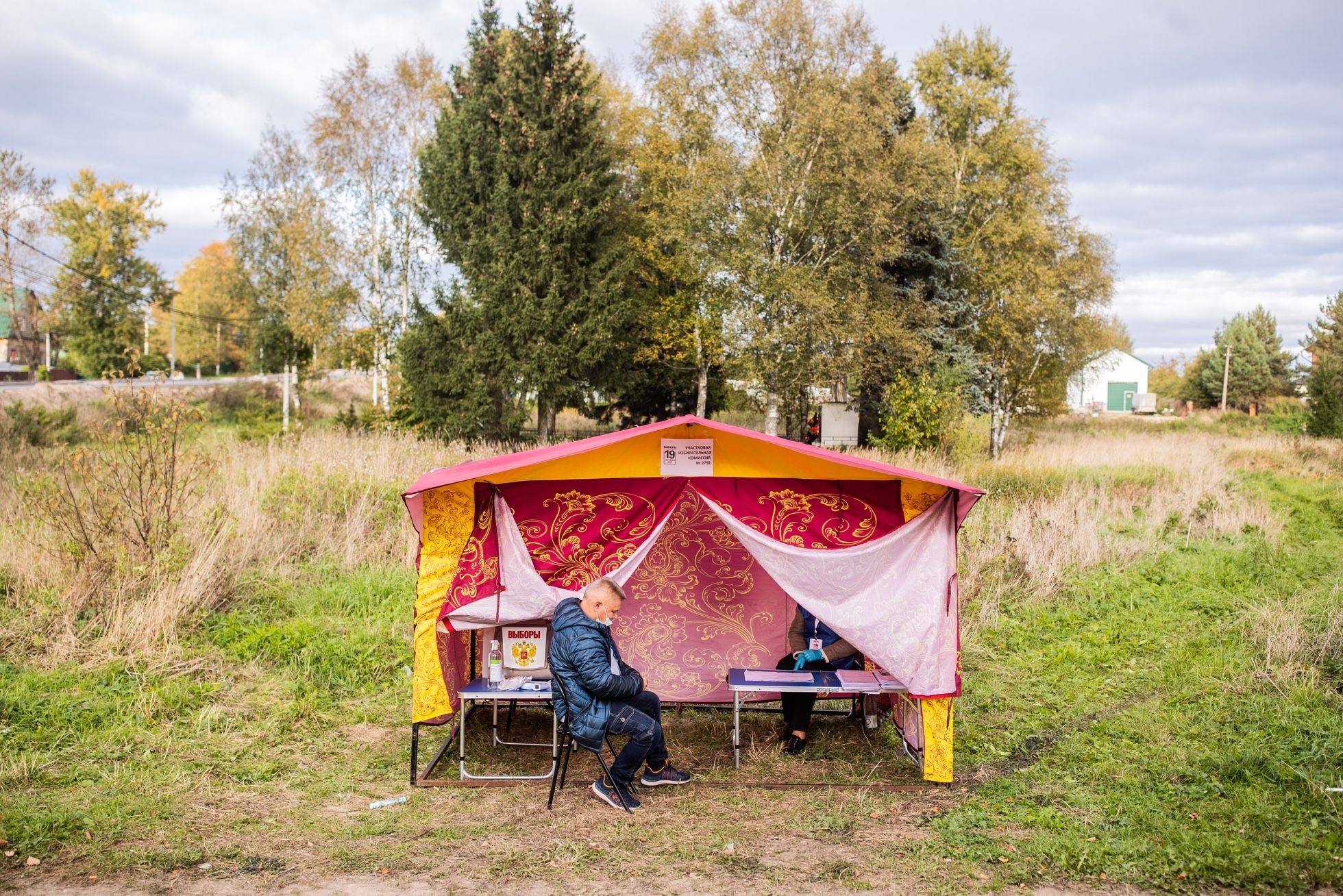 Evgeny Feldman / Meduza Voting off-site in the town of Rogachevo, outside Moscow