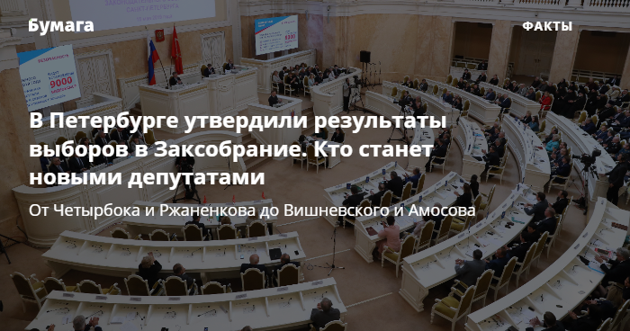 Санкт-Петербургская избирательная комиссия в ночь на 22 сентября утвердила результаты выборов в Заксобрание седьмого созыва. «За» проголосовали 11 членов Горизбиркома, «против» высказались трое — Ольга Покровская от «Яблока», Андрей Беляков от КПРФ и Екатерина Фесик от «Справедливой России».