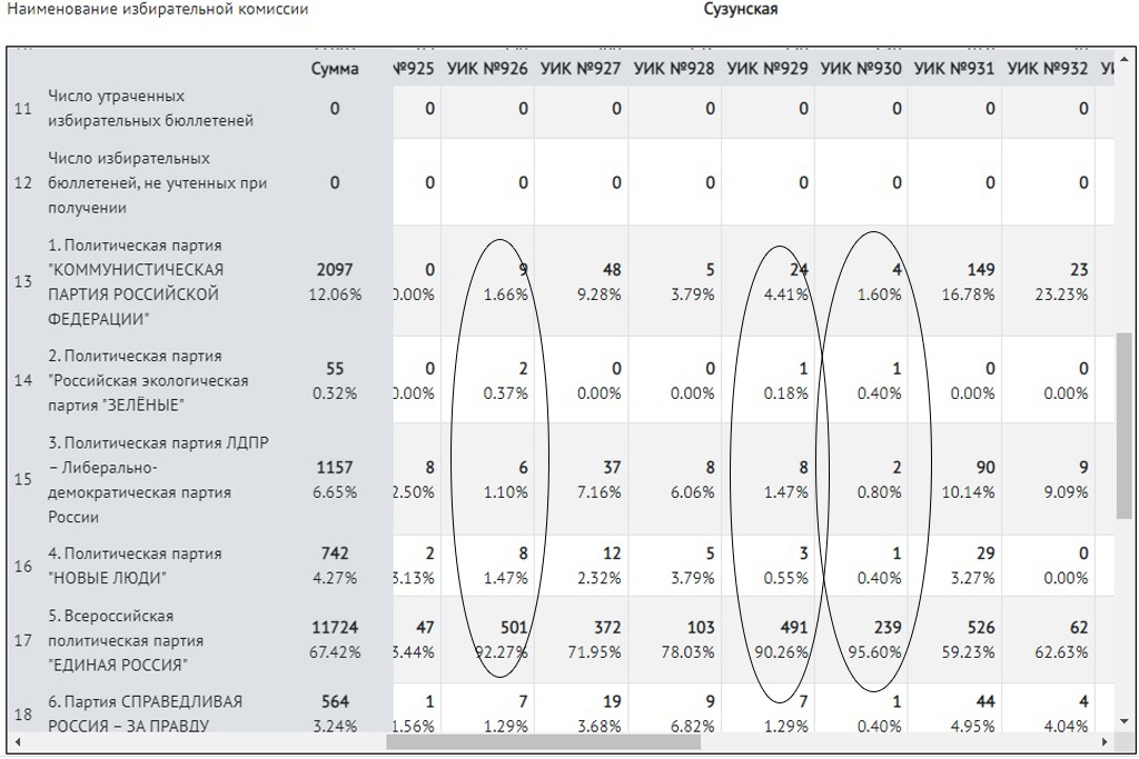 В Сузунском районе особенно выделяются УИКи №930, №929, №926 и №919, где единороссам насчитали более 90% при явке свыше 90%.