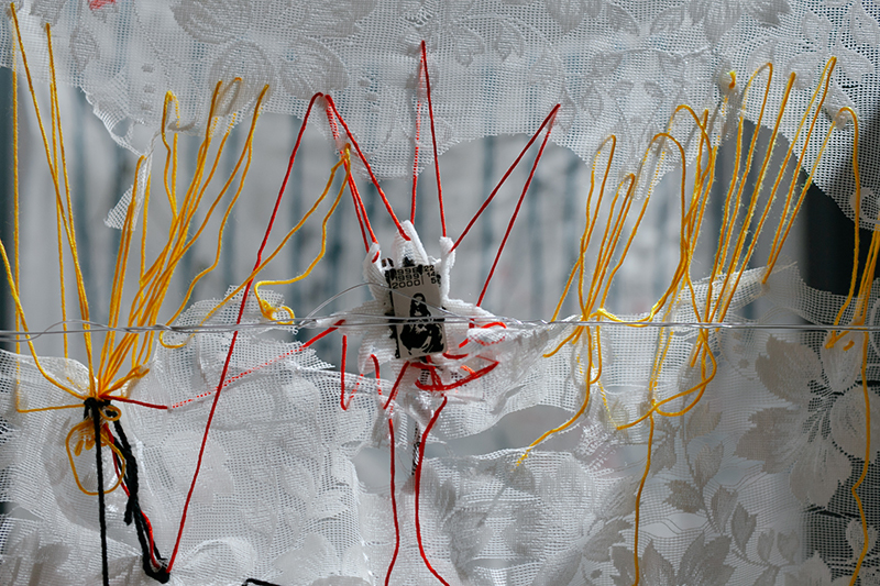 © Анна Марченкова Спецпроект «Создать новый слой» VI Уральской индустриальной биеннале в Тюмени Маша Фоот в Тюмени также знаменита своими комиксами. На сей раз для своего высказывания она решила использовать вышивку. Старый бабушкин тюль пригодился Фоот для работы «Культурный слой», для исследования призрачности, воспоминаний об ушедшем детстве. Вышивки на тюле создали сложную многослойную конструкцию, где прошлое, настоящее и будущее развиваются как несколько информационно-временных измерений. «Где же в этом место человека?» — как бы спрашивает автор.