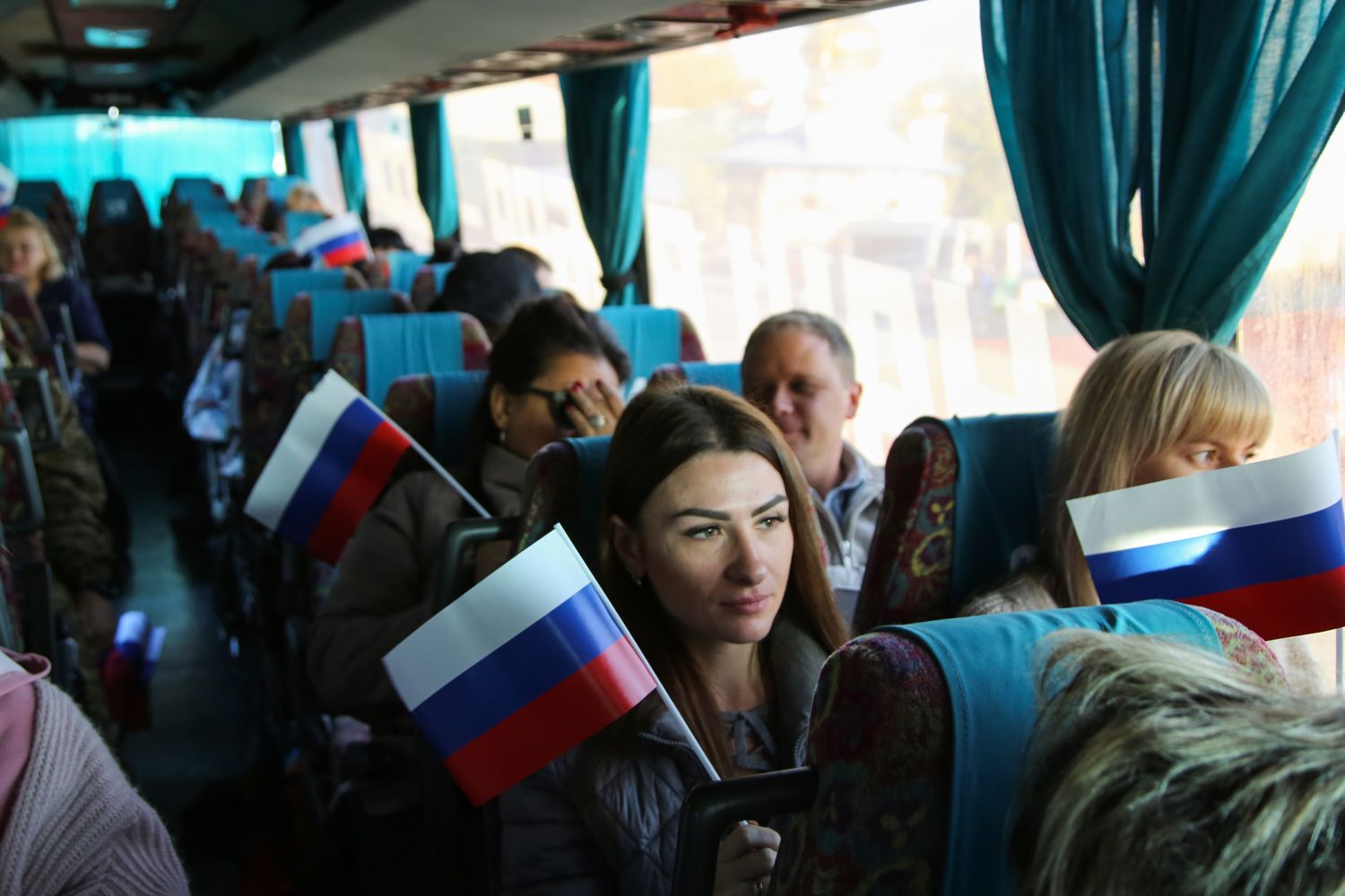 Before getting back on the bus, several DNR residents pour themselves plastic cups of “Russian champagne” and toast to Russia. They say that they voted “for Russia” too — and don’t offer any further explanation.