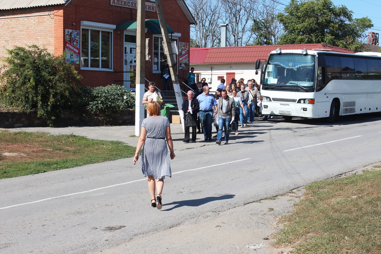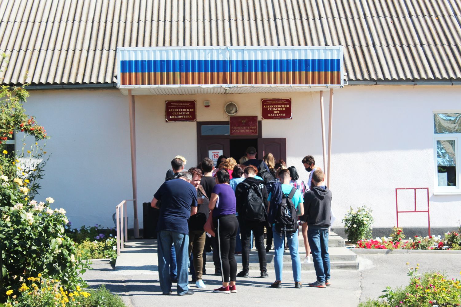 As the couple drives off towards the border, a white tour bus with Rostov plates pulls up. About sixty people get off the bus and a volunteer rushes forward to meet them. “Polling station 1120, everyone this way,” a woman shouts from the entrance to the building. They line up, documents in hand and fiddling with their masks. Members of the territorial election commission refuse to let Meduza’s correspondent into the polling station, but offer reassurances that things are running smoothly and there are no electoral violations.