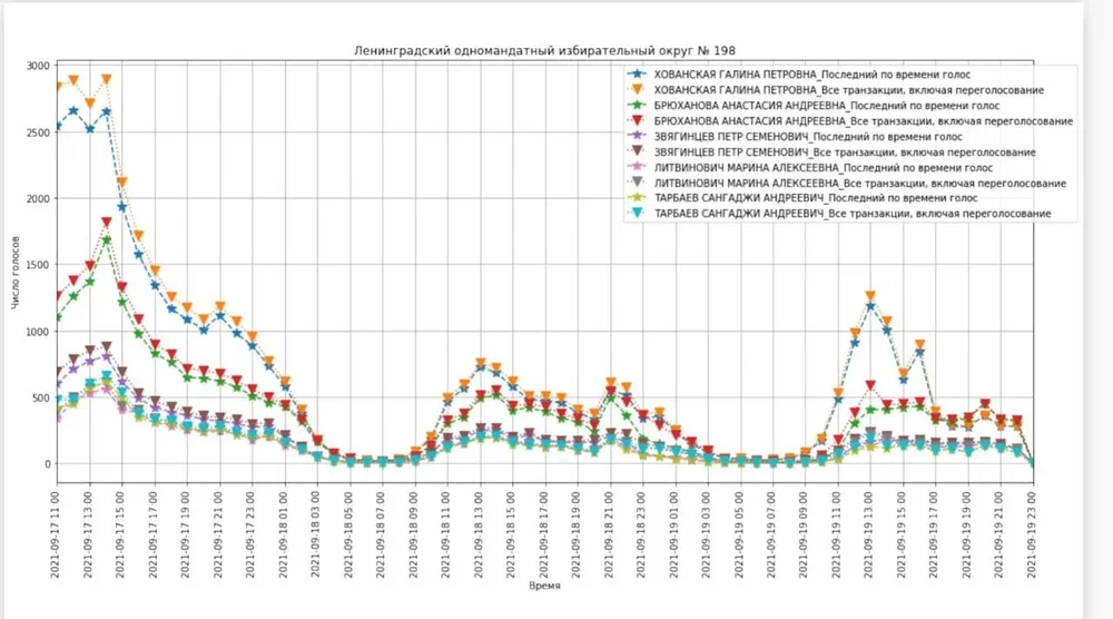 «Аномалии, т.е. вбросы показаны красным и отлично видны даже на графиках общественного штаба. Самое интересное происходит в пятницу и в воскресение утром. На графиках прекрасно виден и обед "избирателей" Хованской, избиратели других кандидатов в округе почему-то в это время не обедают», — отметила Брюханова.