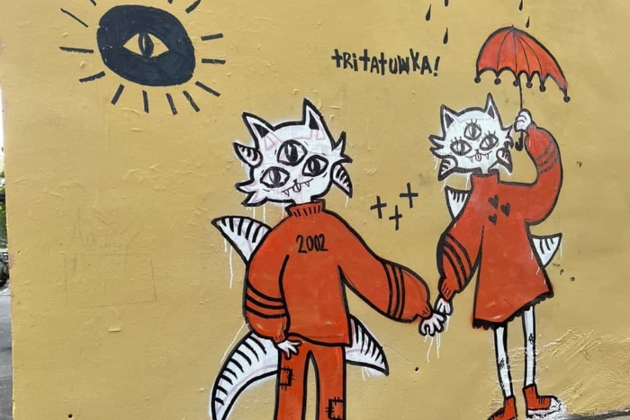 С лета 2021 года на домах Петроградской стороны появляются стрит-арт-работы с космокотами и другими существами. Судя по тегу, их делает петербургская татуировщица tritatuwka.