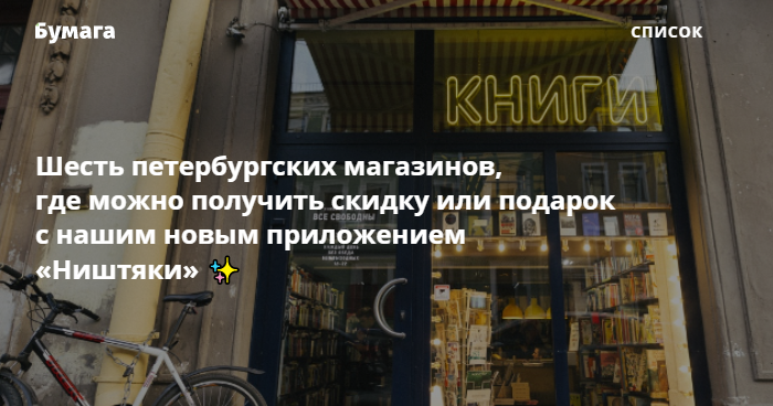«Бумага» выпустила приложение «Ништяки» с подарками и скидками от дружественных локальных магазинов, кафе и баров в Петербурге. Чтобы ими воспользоваться, нужно скачать приложение в App Store или Play Market, выбрать на главной странице заведение и предъявить его сотруднику QR-код. А еще ништяк можно передать другу или подруге, поделившись ссылкой в мессенджере. Количество подарков ограничено — поспешите!