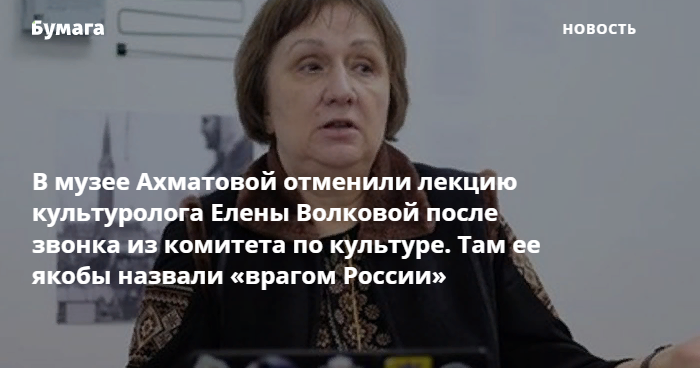 Лекцию доктора культурологии Елены Волковой в музее Анны Ахматовой отменили после звонка из комитета по культуре, где ее якобы назвали «врагом России». Об этом пишет издание «Север.Реалии» со ссылкой на саму Волкову.