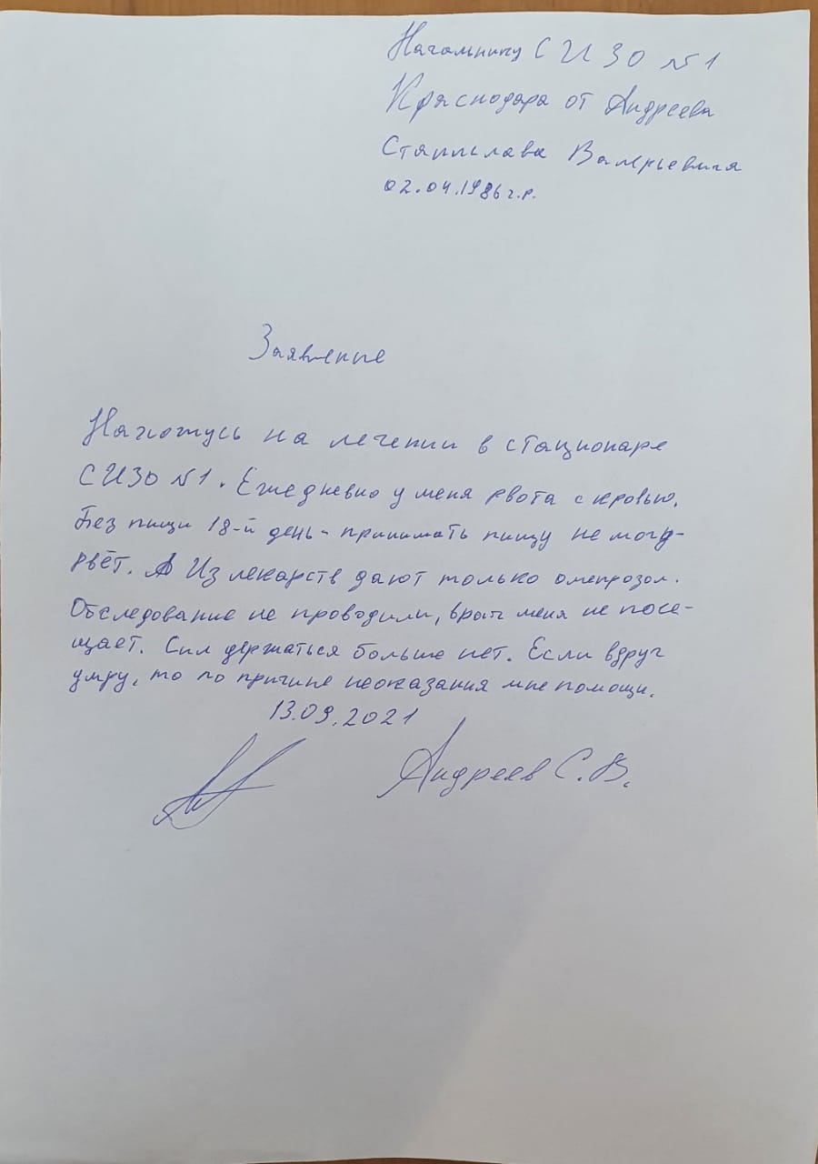 В своем заявлении от 13 сентября на имя начальника СИЗО Андреев пишет, что он 18 дней не может принимать пищу из-за рвоты с кровью. При этом ему отказывают в посещении врача и обследовании. «Сил держаться больше нет. Если умру, то по причине неоказания мне медпомощи», — приводит «ОВД-Инфо» слова арестованного.